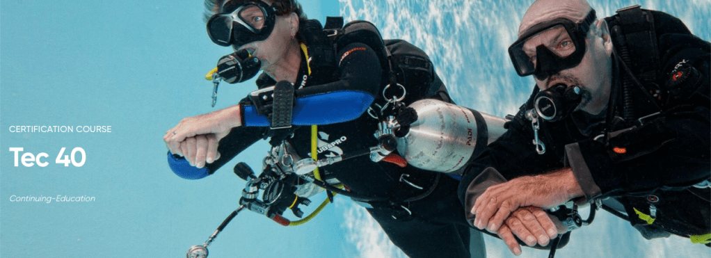 The PADI Tec 40 course is where you transition from recreational scuba diving to technical diving. It’s a great place to start because it’s the first subdivision of the full PADI Tec Diver course and bridges the gap between no stop diving and full technical deep decompression diving. You gain experience and begin building the knowledge and skills you need to continue your tec diver training. You will qualify to make limited decompression dives to 40 metres/130 feet.